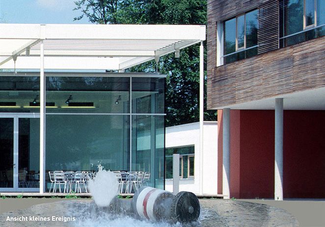 For this project, I proposed a 2:1 scale replica of an overturned hydrant as the main actor on a forecourt paved with pavement slabs. At irregular intervals a fountain of water was to shoot up from the bottom outlet of the sculpture - whereby the supposed flooding was to flow in regulated paths through invisible wind guards and hidden drainage points at the upper edge of the fountain area.