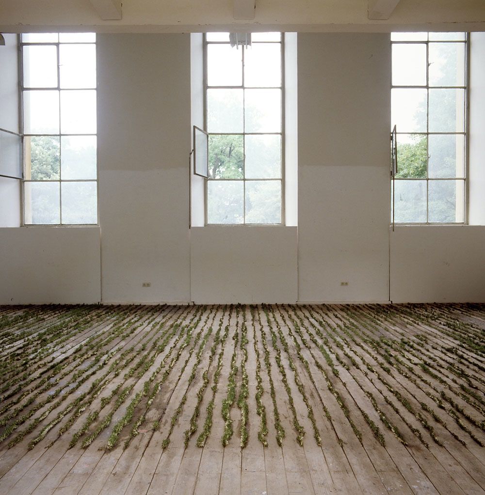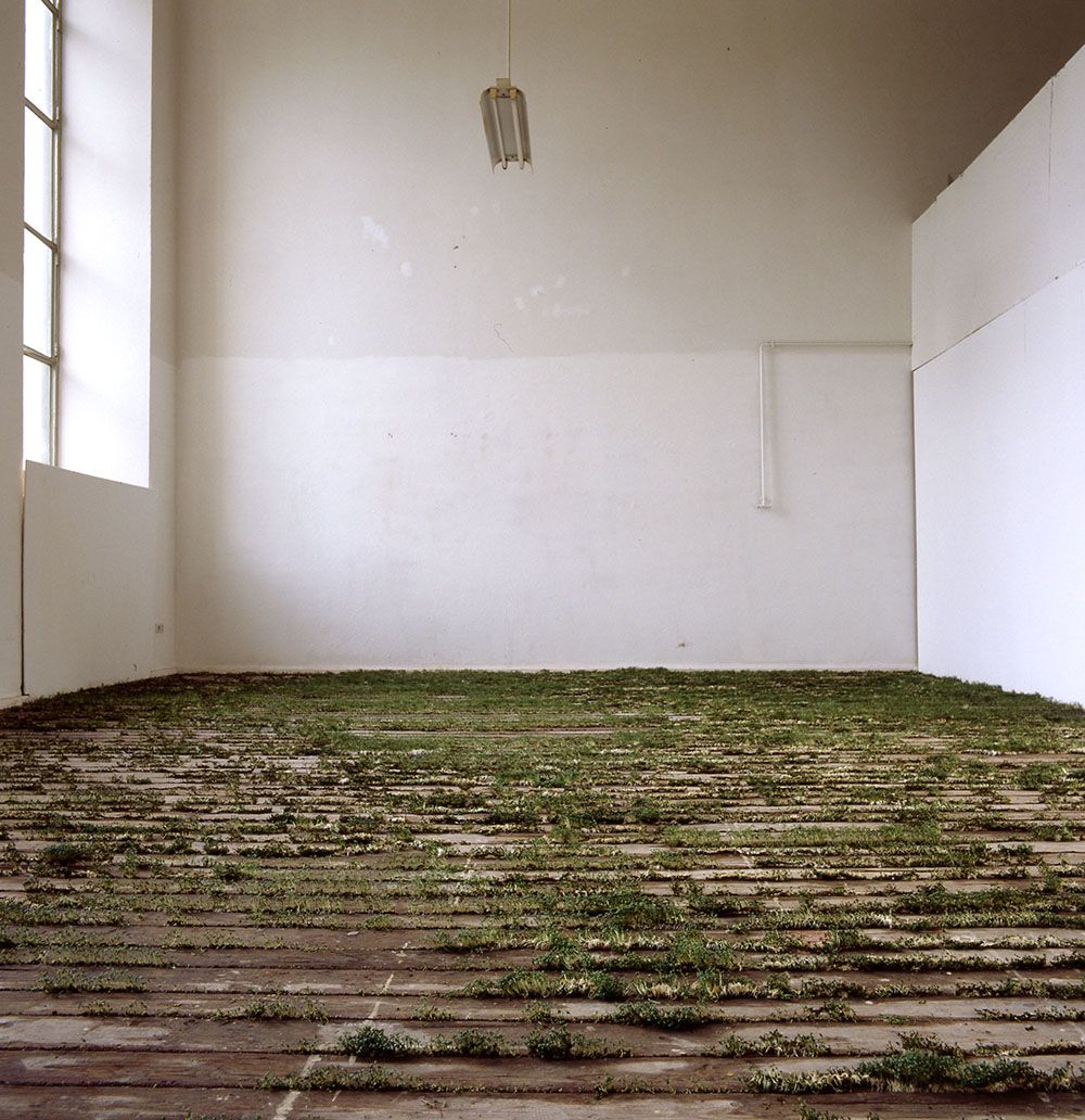 I turned the classroom into a garden. First I cleaned the cracks between the wooden planks and then planted a mixture of soil and cress seeds, similar to furrows in a field. Every day I observed how the plants increasingly took possession of the space and how it slowly transformed the interior space, corresponding with the exterior space.
