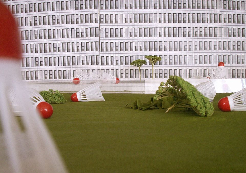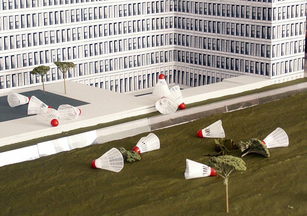 15 four-meter-high shuttlecocks, formed from sheet steel and painted, were to "play" on the field between the terraces of the new BND building and the adjacent Pankepark (outside the dedicated area) in order to draw attention to the spectrum of possible associations between attack and defence, between friendly play and enemy combat.