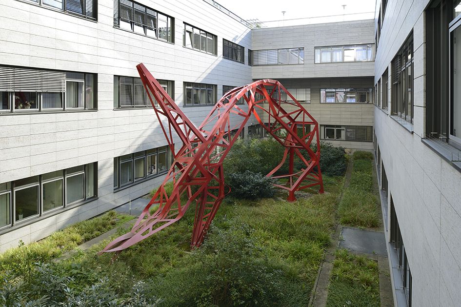 Den Nachbau eines deformierten Merklin-Stahlgittermastes im Maßstab 1:1 darstellend bezieht sich die Skulptur auf ein in vielen Mythen verkörpertes feuerspeiendes Mischwesen, das die Überwindung von Schwierigkeiten vor Erreichen eines hohen Ziels symbolisiert: Vor allem in China und Japan wird der Drachen als glücksbringend und Dämonen abweisend verehrt. Der zum Drachen umgeformte Strommast soll Patient*innen, Klinikpersonal und Besucher an diese Qualitäten erinnern.