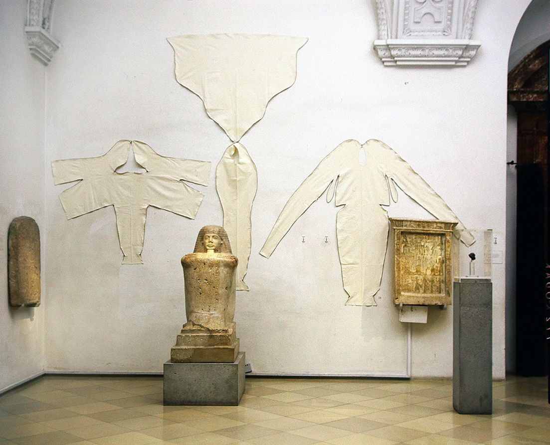 Ich nähte eine Person in den drei klassischen Positionen Ägyptischer figürlicher Repräsentation in Nesseltuch ein, schnitt das Material an den Kanten auf und setzte Reißverschlüsse in die Nahtstellen ein. Die Tuchteile wirken wie Nähmuster oder Architekturpläne und überlassen es den Betrachter*innen, sie im Kopf zu einem räumlichen Gebilde zu kombinieren.