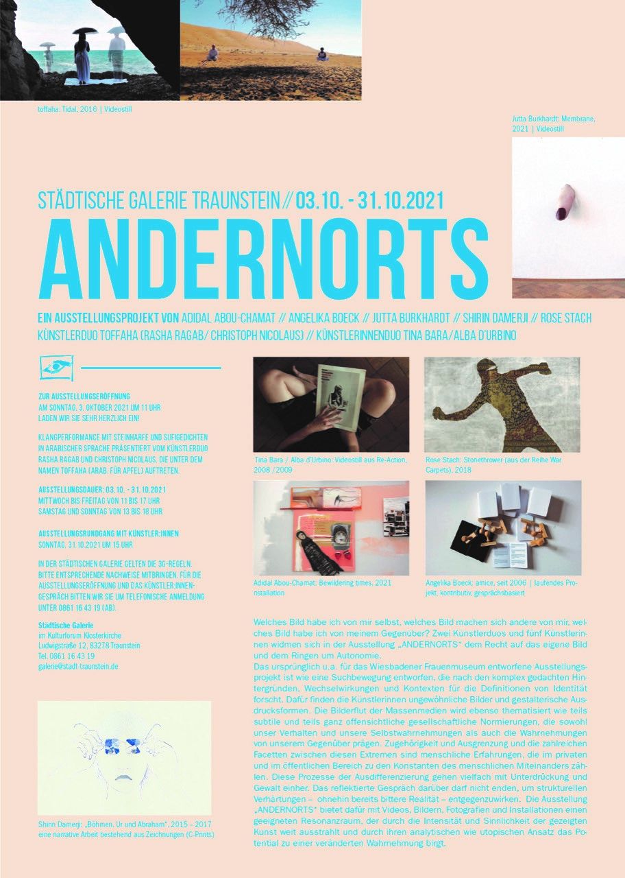 The exhibition features works by Adidal Abou-Chamat, Angelika Boeck, Jutta Burkhardt, Shirin Damerji, Rose Stach, artist duo Toffaha, Tina Bara and Alba DUrbino.