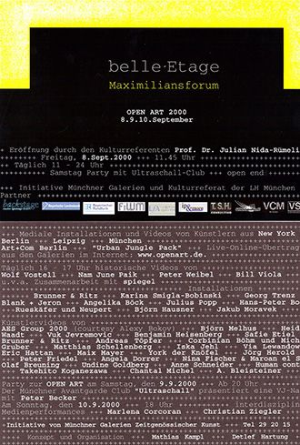 Die von von Matthias Kampl anlässlich der Openart 2000 kuratierte Ausstellung zeigte im Maximiliansforum Life-Übertragungen aus den Galerien Art + Com Berlin und Urban Jungle Pack, historische Videos von Wolf Vostell, Nam June Paik, Peter Weibel und Bill Viola, Installationen von Brunner & Ritz, Karina Smigla-Bobinski, Georg Trenz, Blank + Jeron, Angelika Böck, Julius Popp, Hans-Peter Bo, Rueskäfer + Neupert, Björn Hausner und Jakub Moravek, sowie Künstlervideos von AES Group 2000, Björn Melhus, Heidrun Waadt, Vuk Jevremovic, Benjamin Heisenberg, Safie Etiel Gruber, Matthias Schellenberg, Iska Jahl, Via Lewandowski, Brunner & Ritz, Andreas Töpfer, Corbinian Böhm und Michael Gruber, Eric Hattan, Maix Mayer, York der Knöfel, Jörg Herold, Peter Friedel, Angela Dorrer, Nina Fischer & Maron, Olaf Breuning, Undine Goldberg, Anna Schneider Human contact, Takehito Koganezawa, Chantal Michel, und Anette Bleisteiner, sowie Medienperformances von Marlena Corcoran und Christian Ziegler.