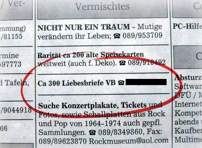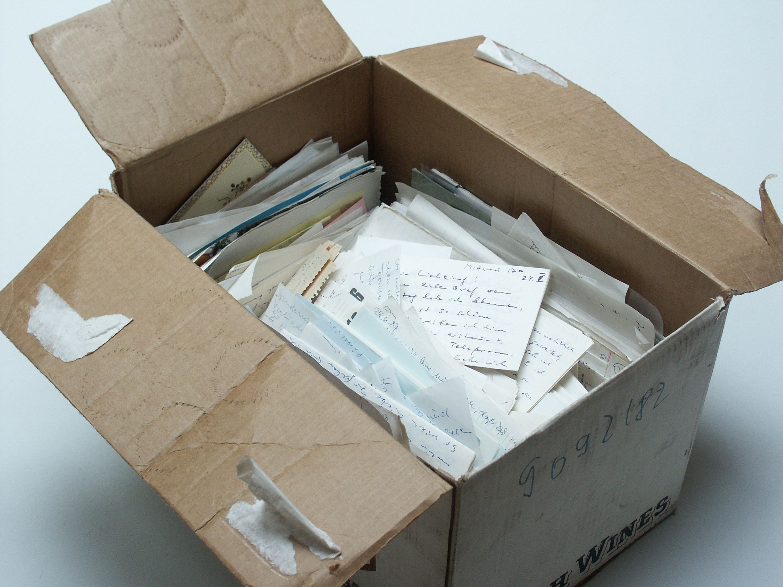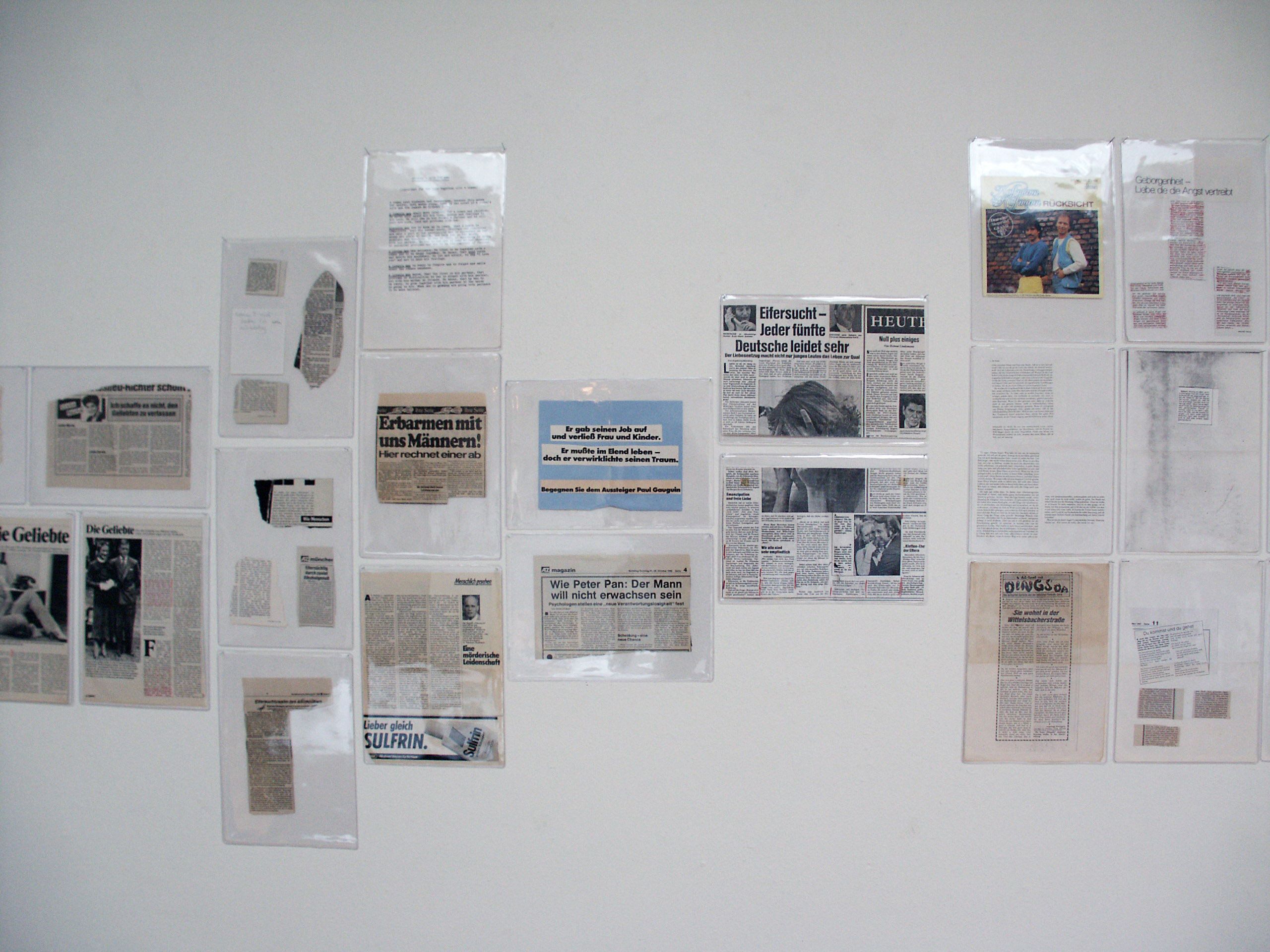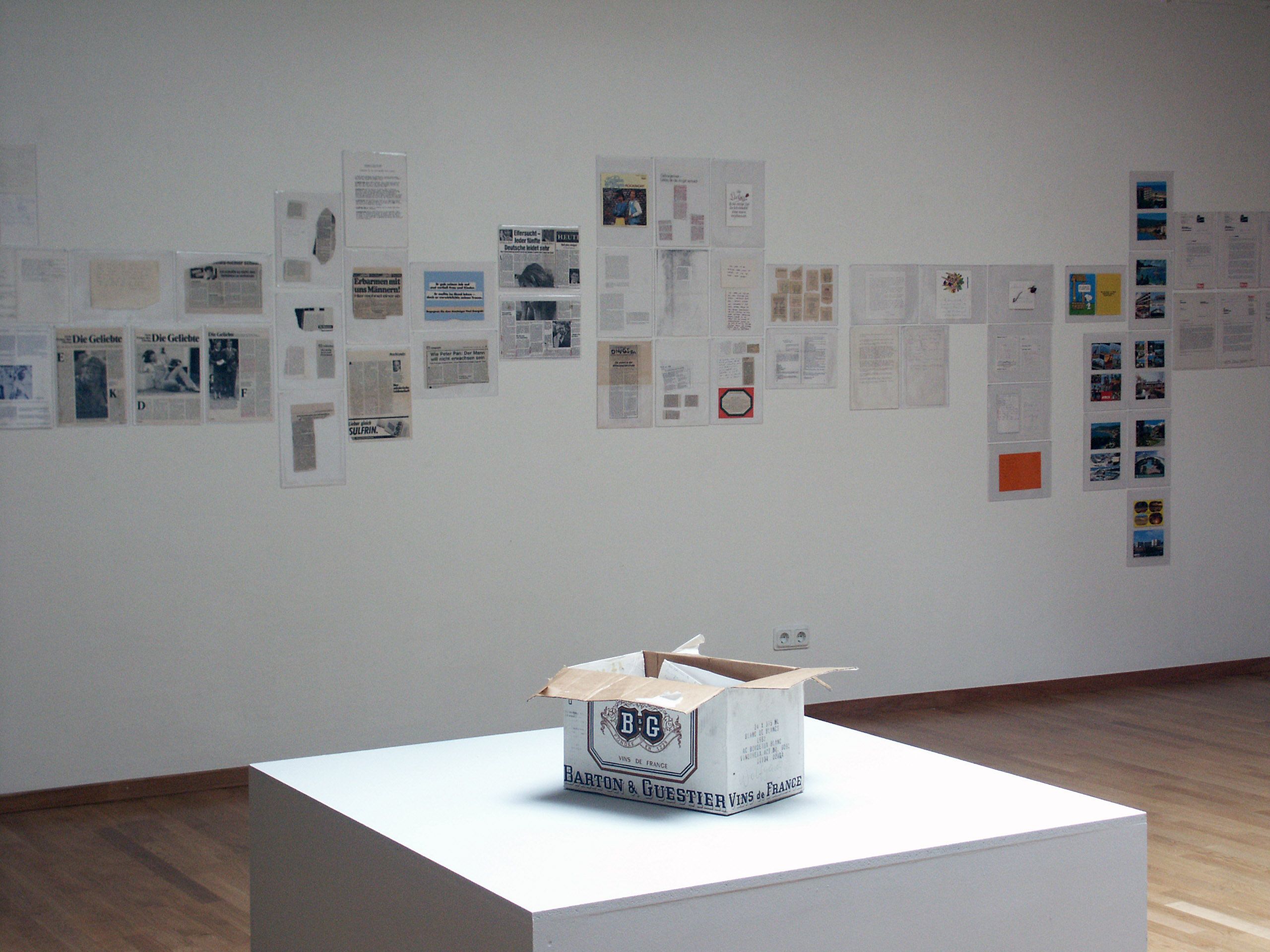 The installation consists exclusively of the purchased material. While the private letters can be seen untouched in their cardboard box on a pedestal, newspaper articles on the subject of love and correspondence with reader advisors, as well as all documents and messages without direct address, hang on the wall in transparent sleeves.