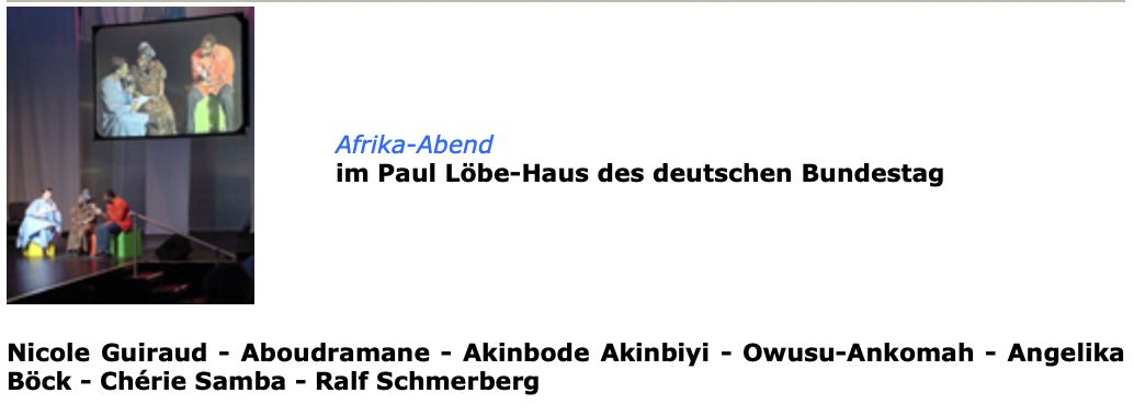 The exhibition curated by Peter Herrmann for an event at the Bundestag, presented contemporary artistic works that deal in one way or another with African themes. Participating artists were Nicole Guiraud, Aboudramane, Akinbode Akinbiyi, Owusu-Ankomah, Angelika Böck, Chérie Samba, and Ralf Schmerberg.